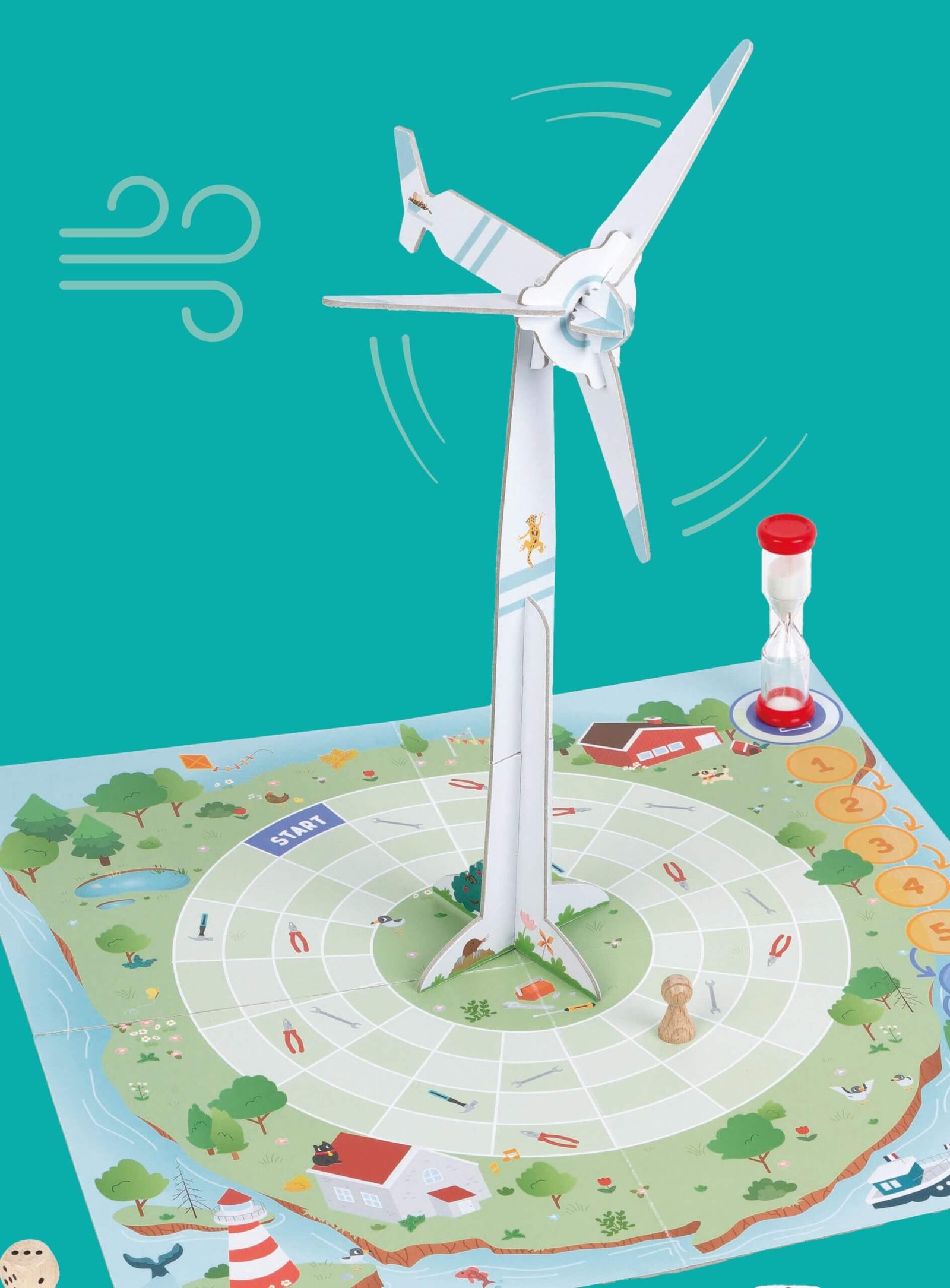 Un aerogenerador con 7 partes, un tablero de juego, 15 fichas, 30 piezas, un dado y un reloj de arena.