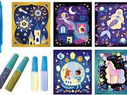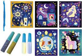 5 escenas adhesivas para decorar con 2 tubos de arena fosforescentes, 2 tubos de purpurina, 1 espátula y 1 manual con modelos y instrucciones.