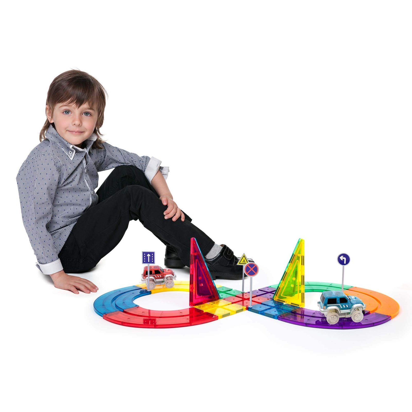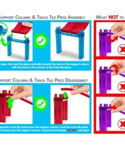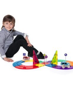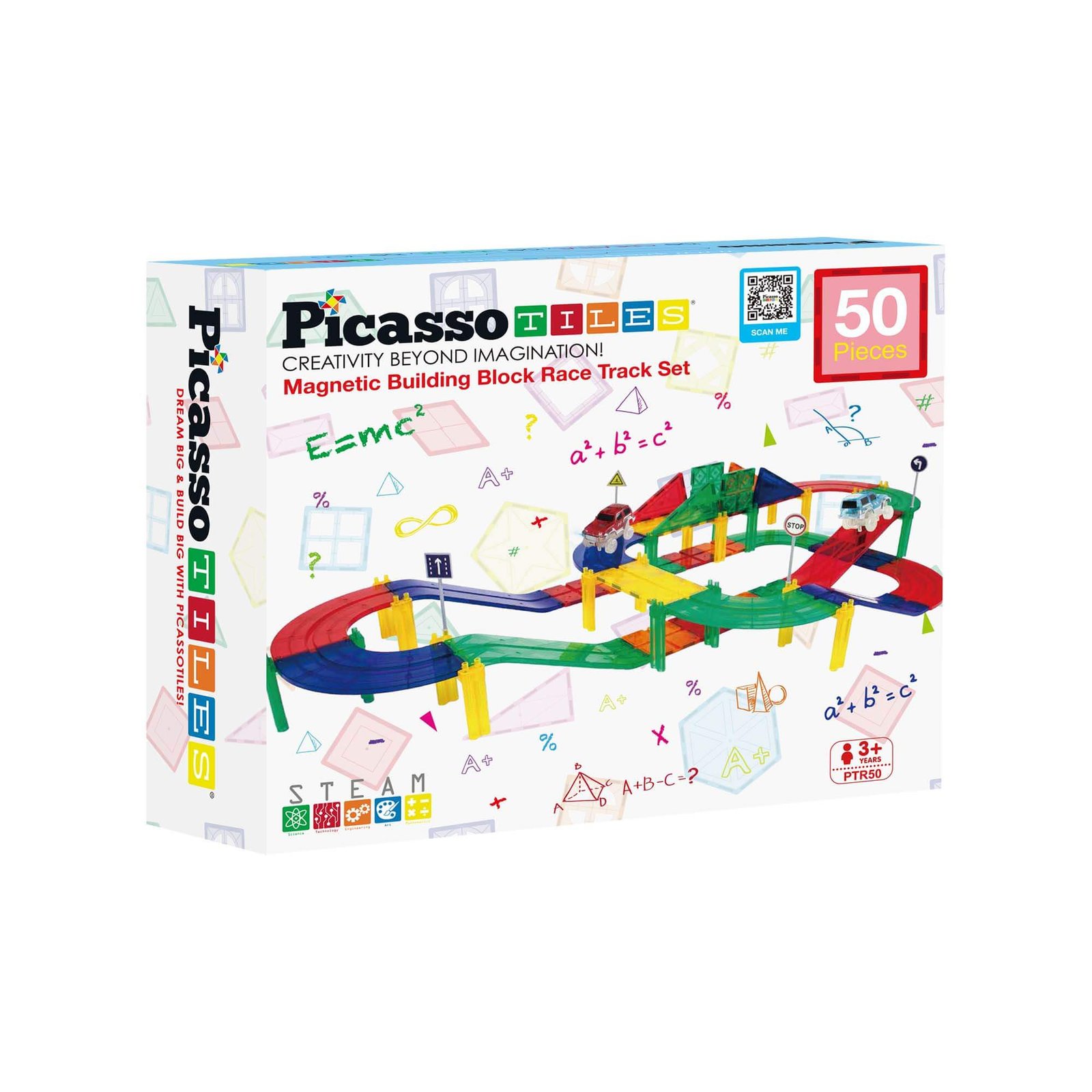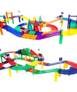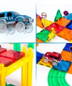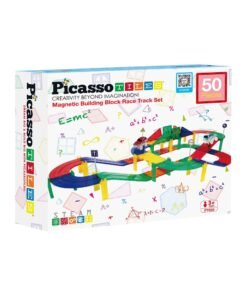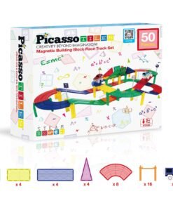 Picassotiles – Juego de 50 piezas de bloques de construcción de pista de coches de carreras, TOYSTORE educativos, fichas magnéticas, juego de bricolaje con 2 vástagos de coche iluminados, kit de construcción de aprendizaje, coordinación mano-ojo, entrenamiento de habilidades motoras finas, desarrollo del cerebro infantil, PTR50